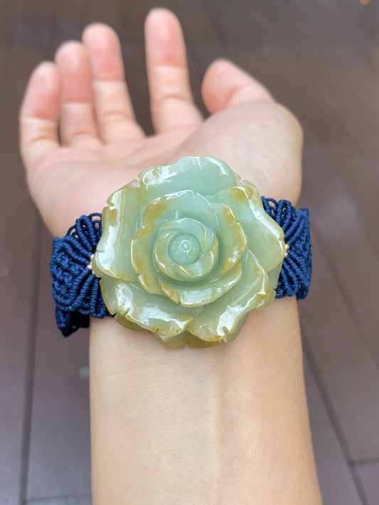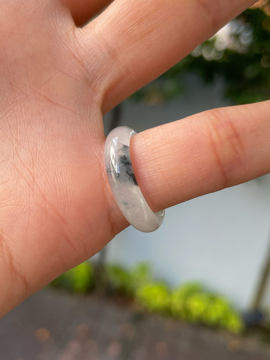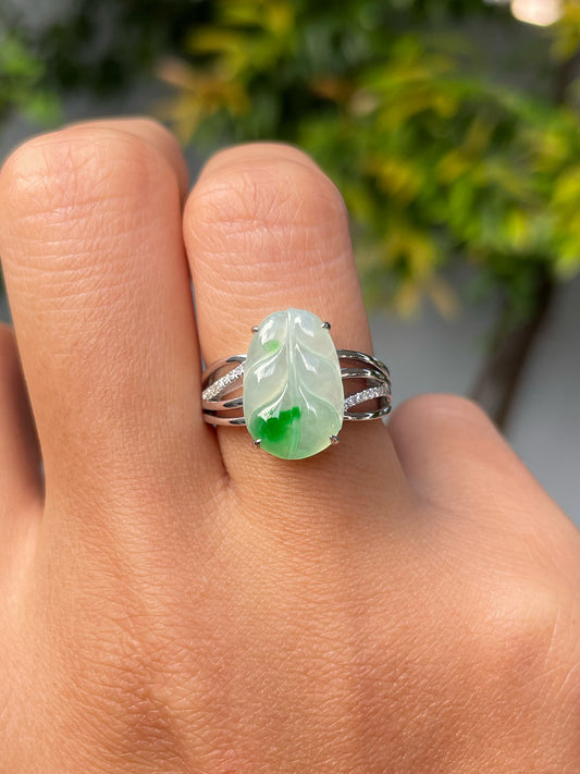 White With Green Jadeite Ring - Leaf Carving 叶子 (NJR251)