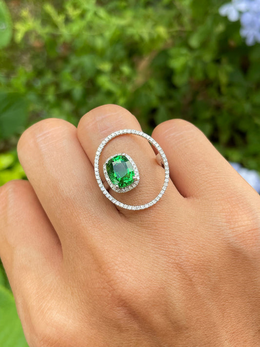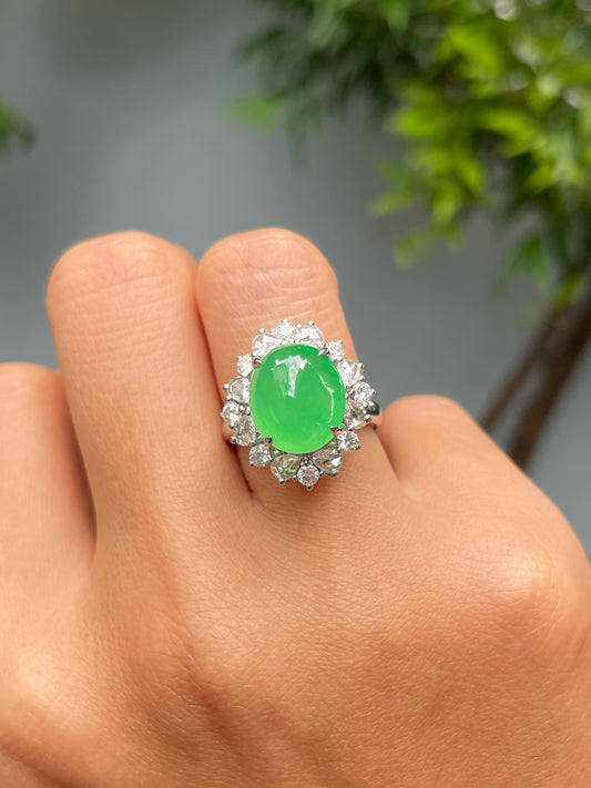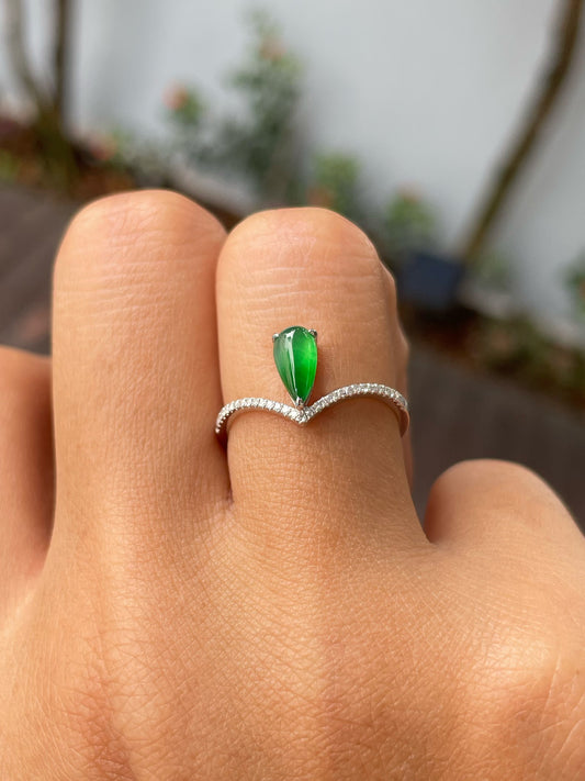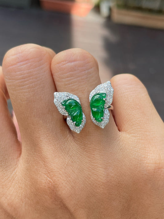 White With Green Jadeite Ring - Leaf Carving 叶子 (NJR251)
