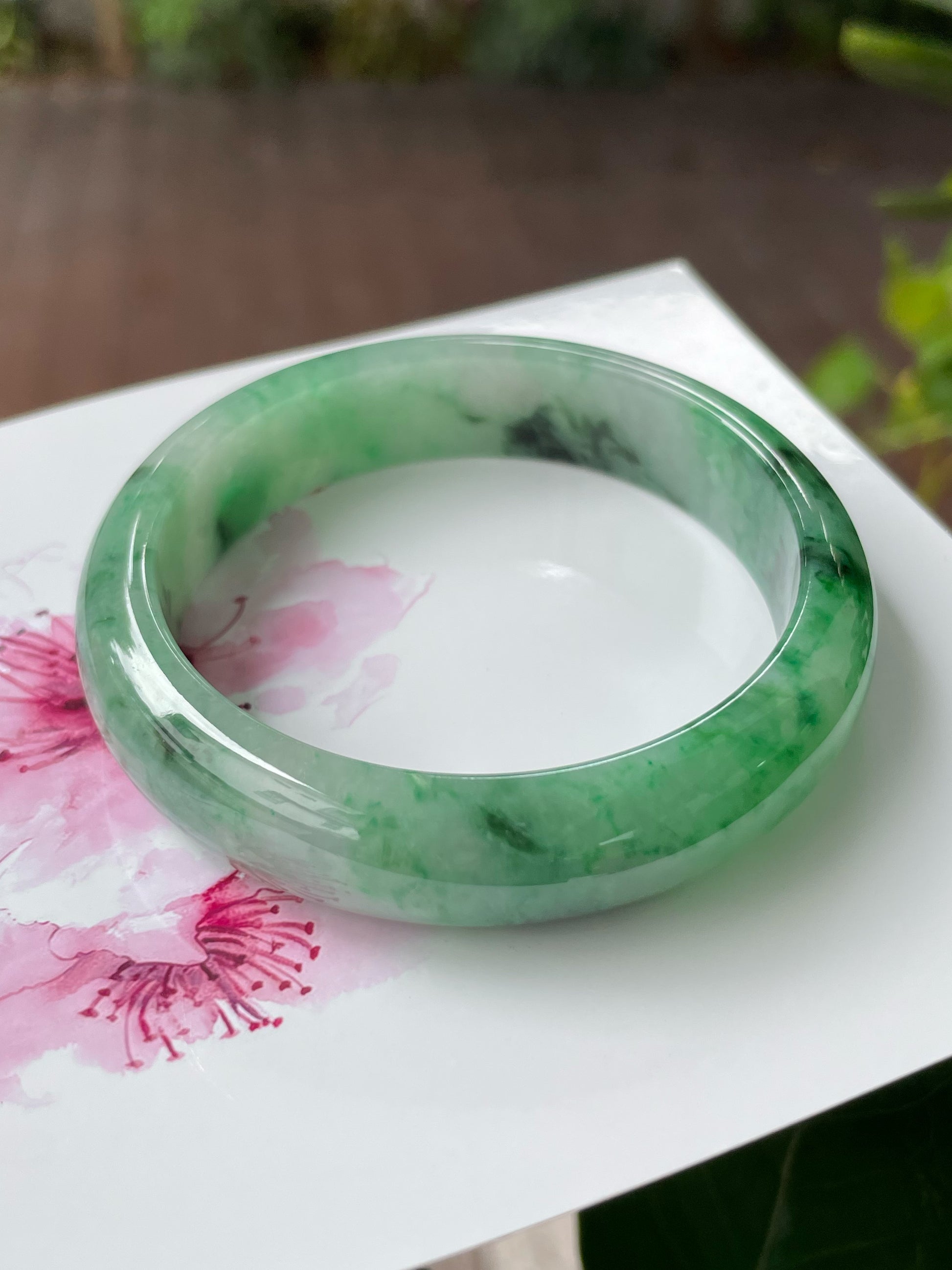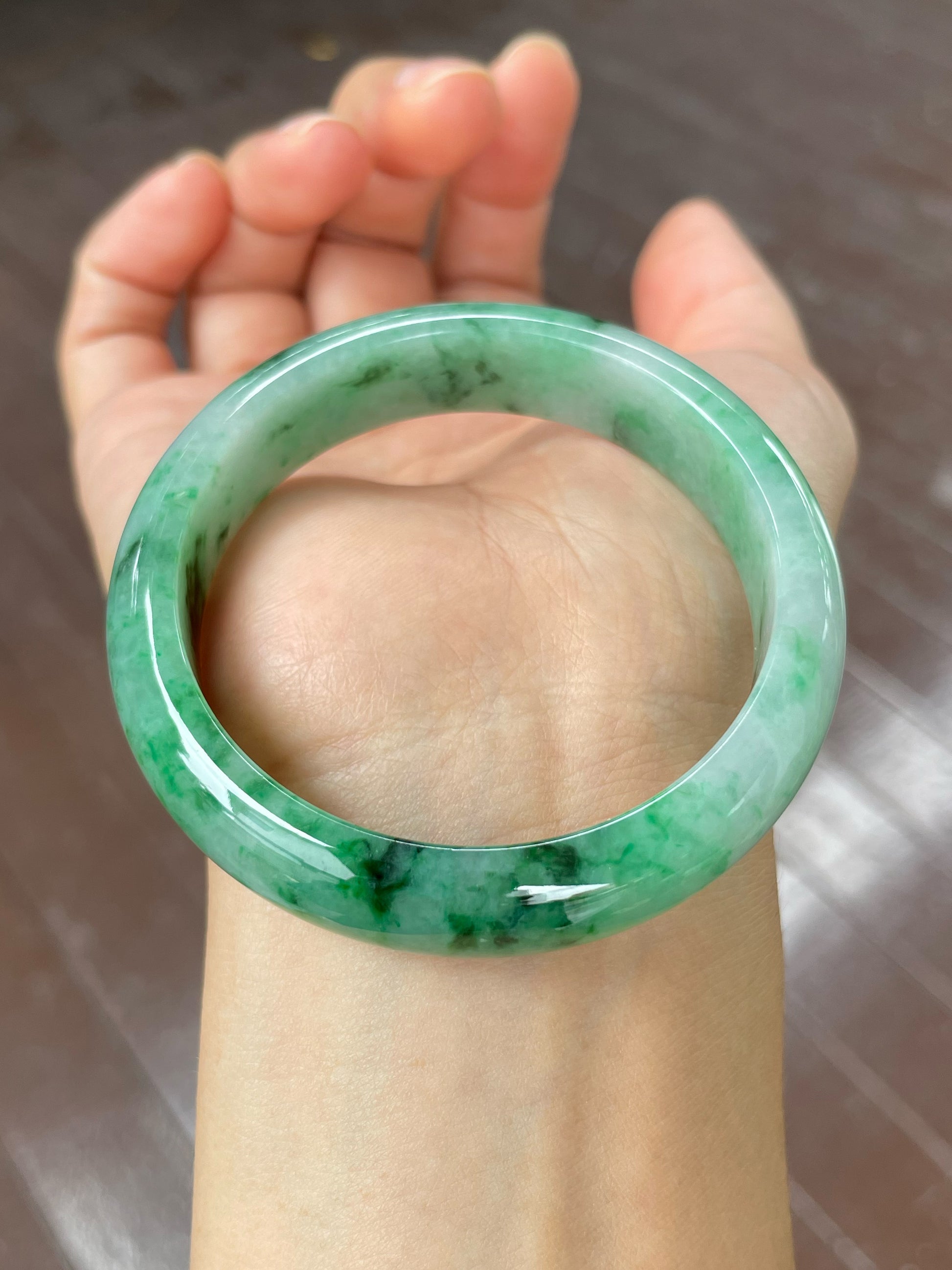 All photos featured are taken in natural lighting and are not enhanced in any way. What you see here is representative of the actual quality of the jadeite bangle. The last 2 photos in the photo collection are taken in indoor lighting. The jadeite bangle is natural and Type A.