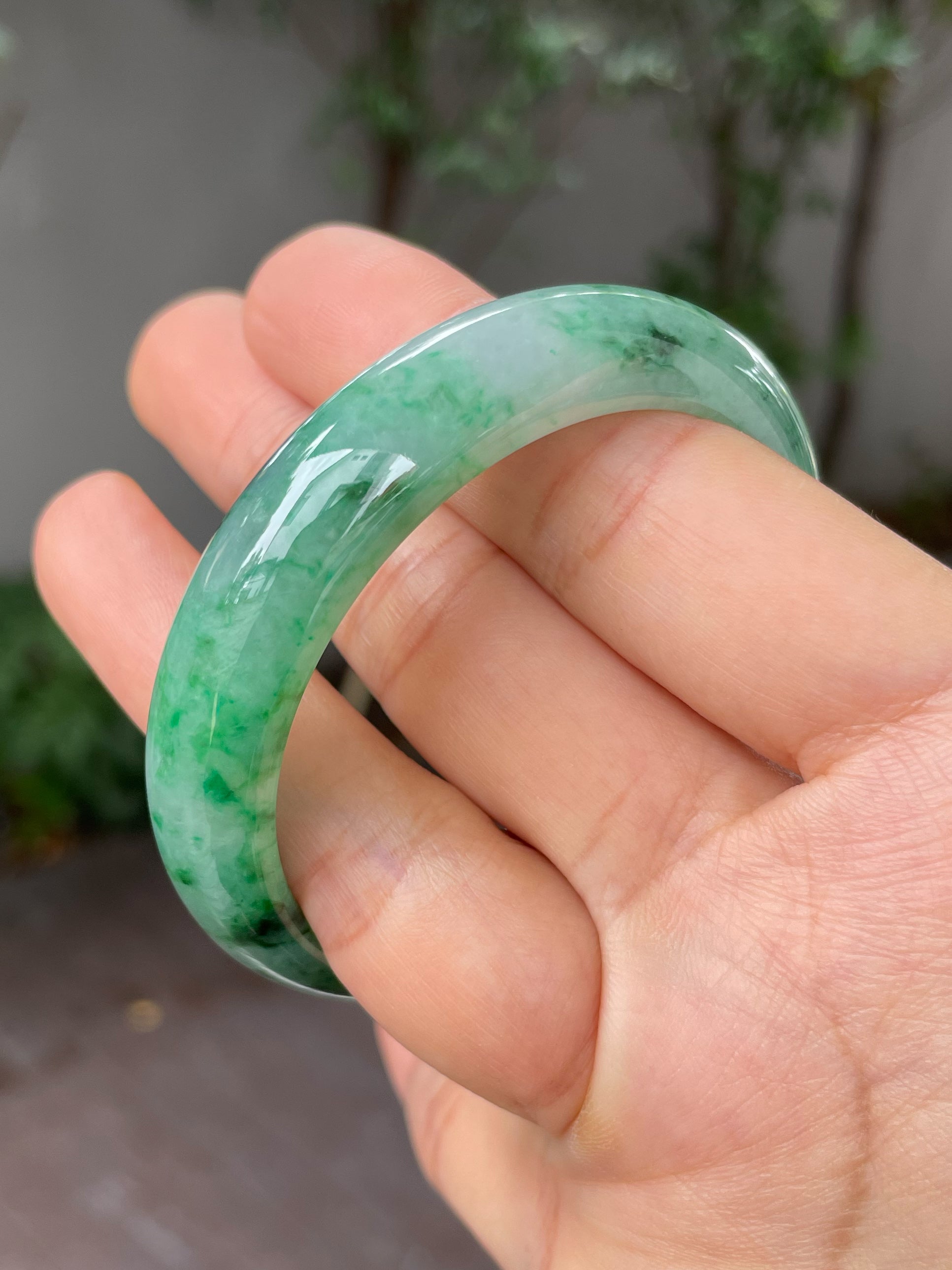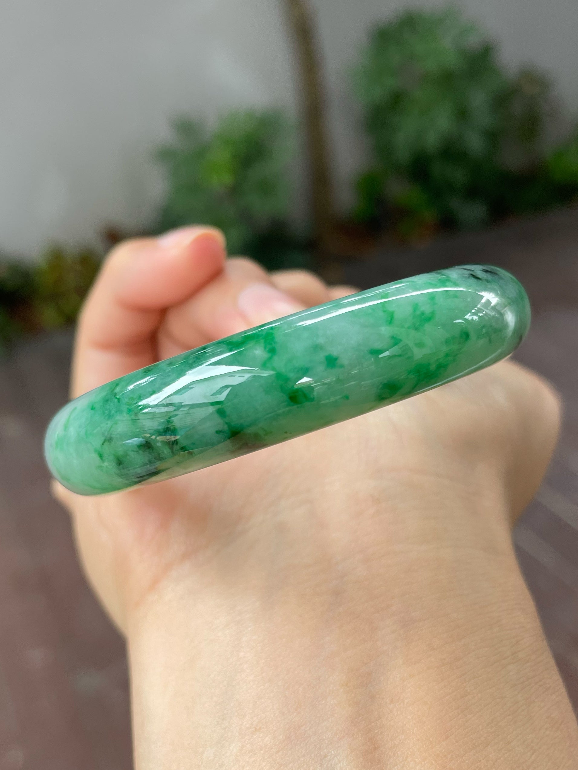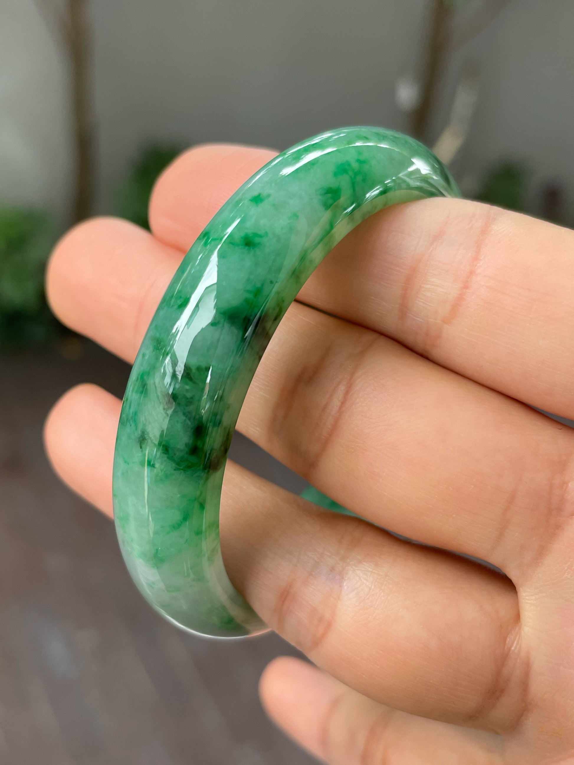 Deeper green hues are mixed with vibrant green hues in this Type A jade bangle. The mix of green hues is spread across the body of the green jade bangle giving it a refined appearance. In jadeite, such flowing patterns with its alluring blend of colours is like an art design, albeit created by nature.