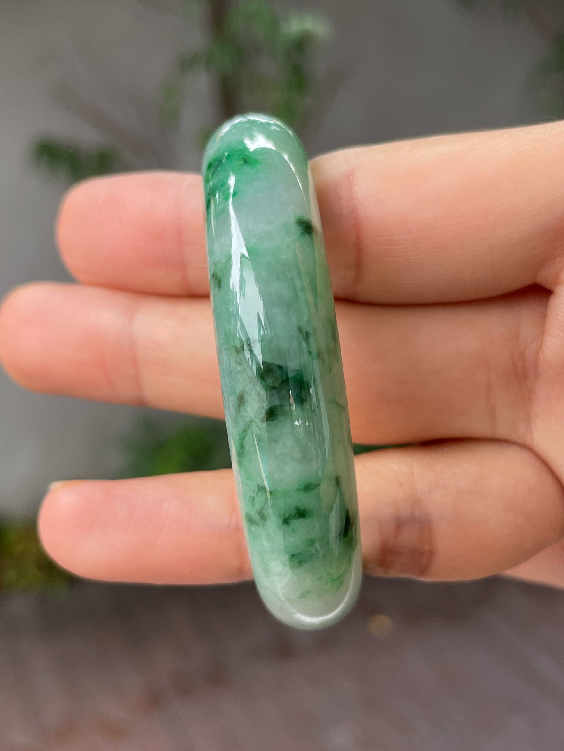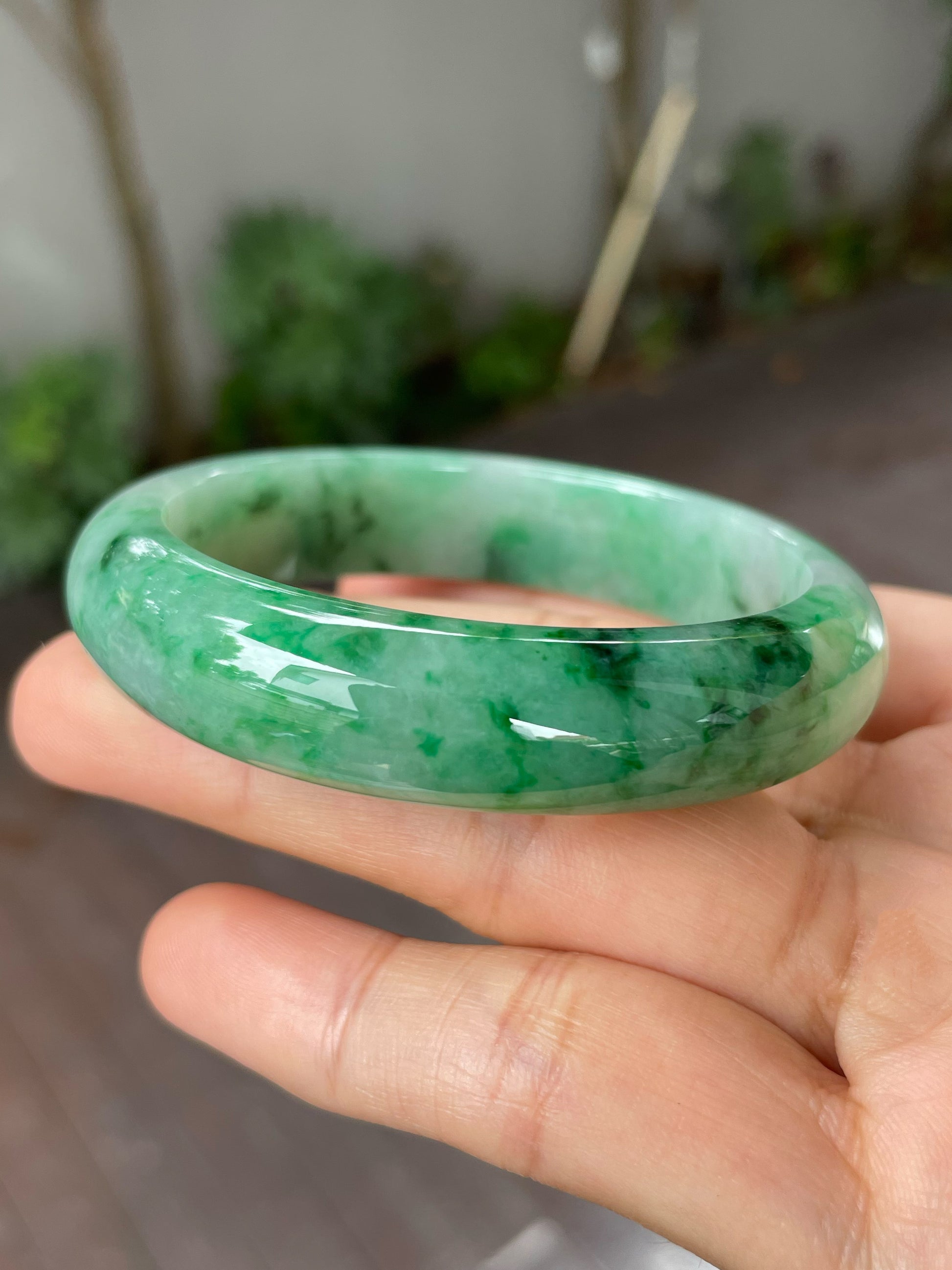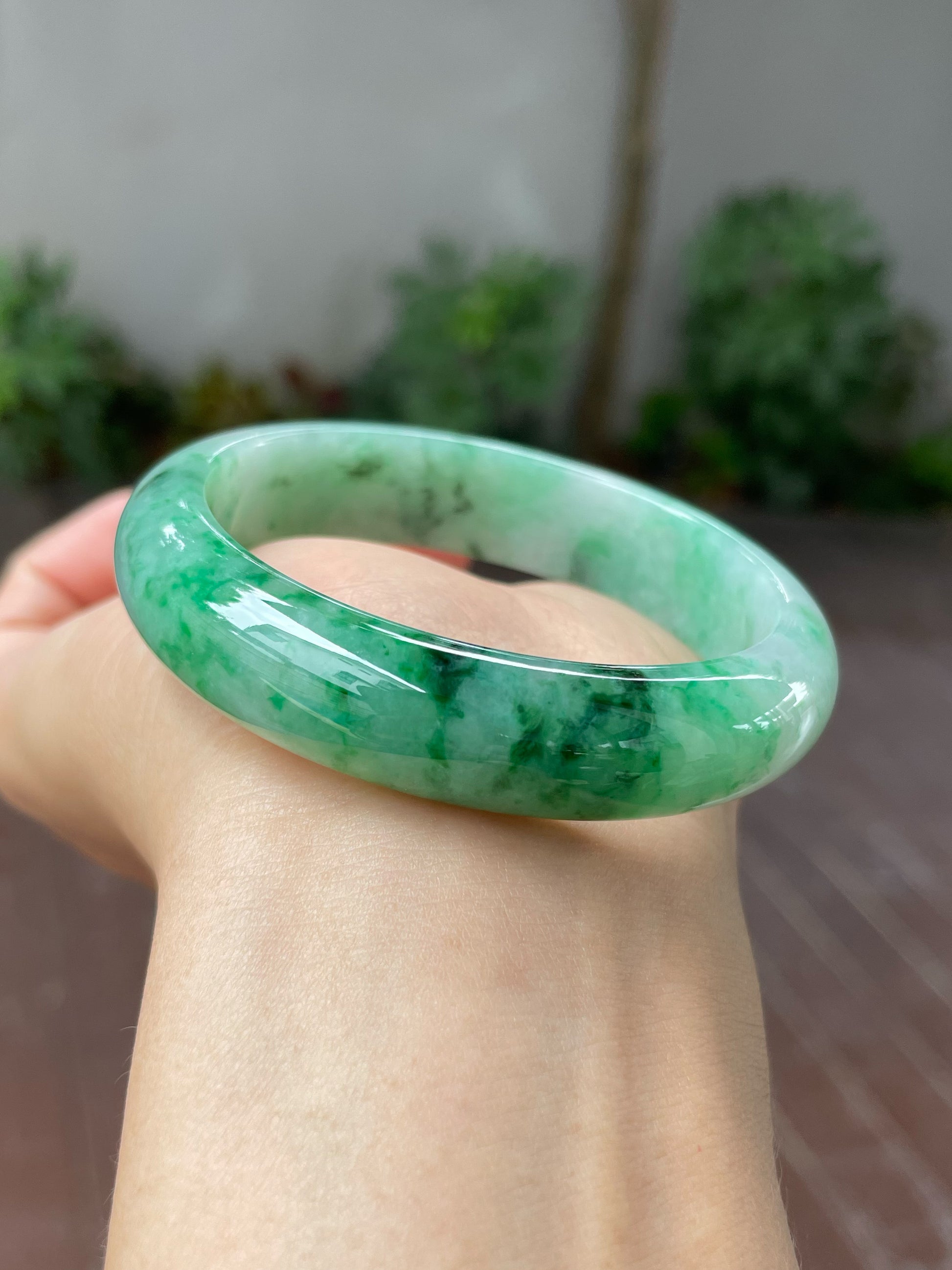 Deeper green hues are mixed with vibrant green hues in this Type A jade bangle. The mix of green hues is spread across the body of the green jade bangle giving it a refined appearance. In jadeite, such flowing patterns with its alluring blend of colours is like an art design, albeit created by nature.