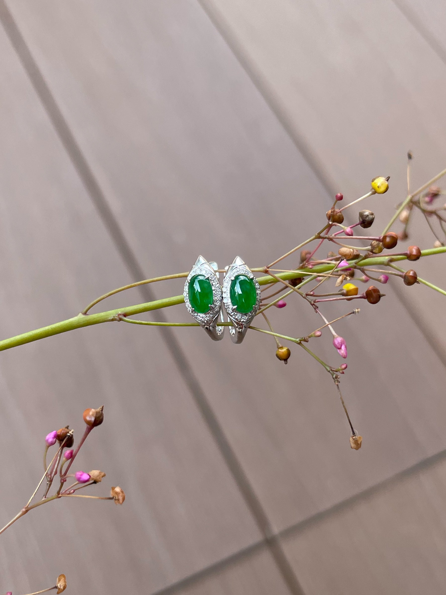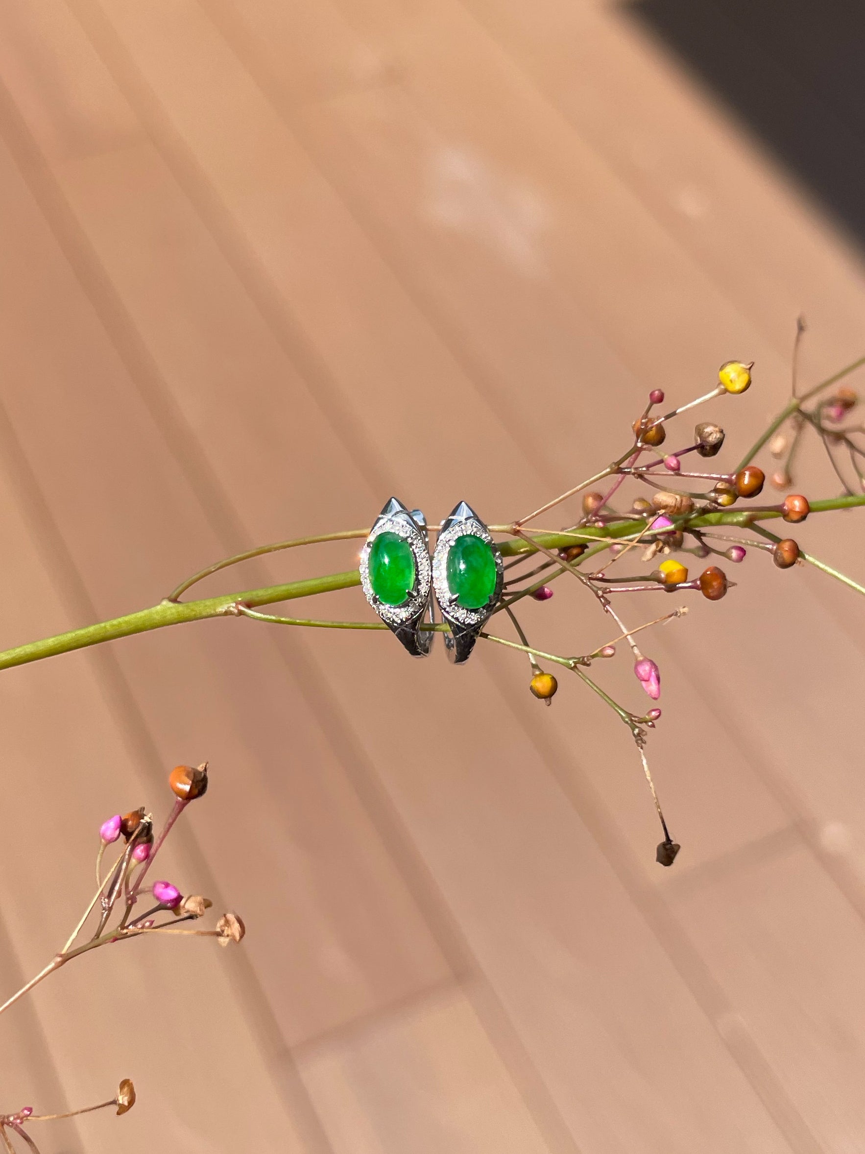 This is a pair of jadeite huggie earrings beautifully crafted in 18K white gold. The Type A vivid green jadeite cabochons lie within a halo of diamonds, creating a striking contrast between the glowing green and the brilliant sparkles of natural diamonds.