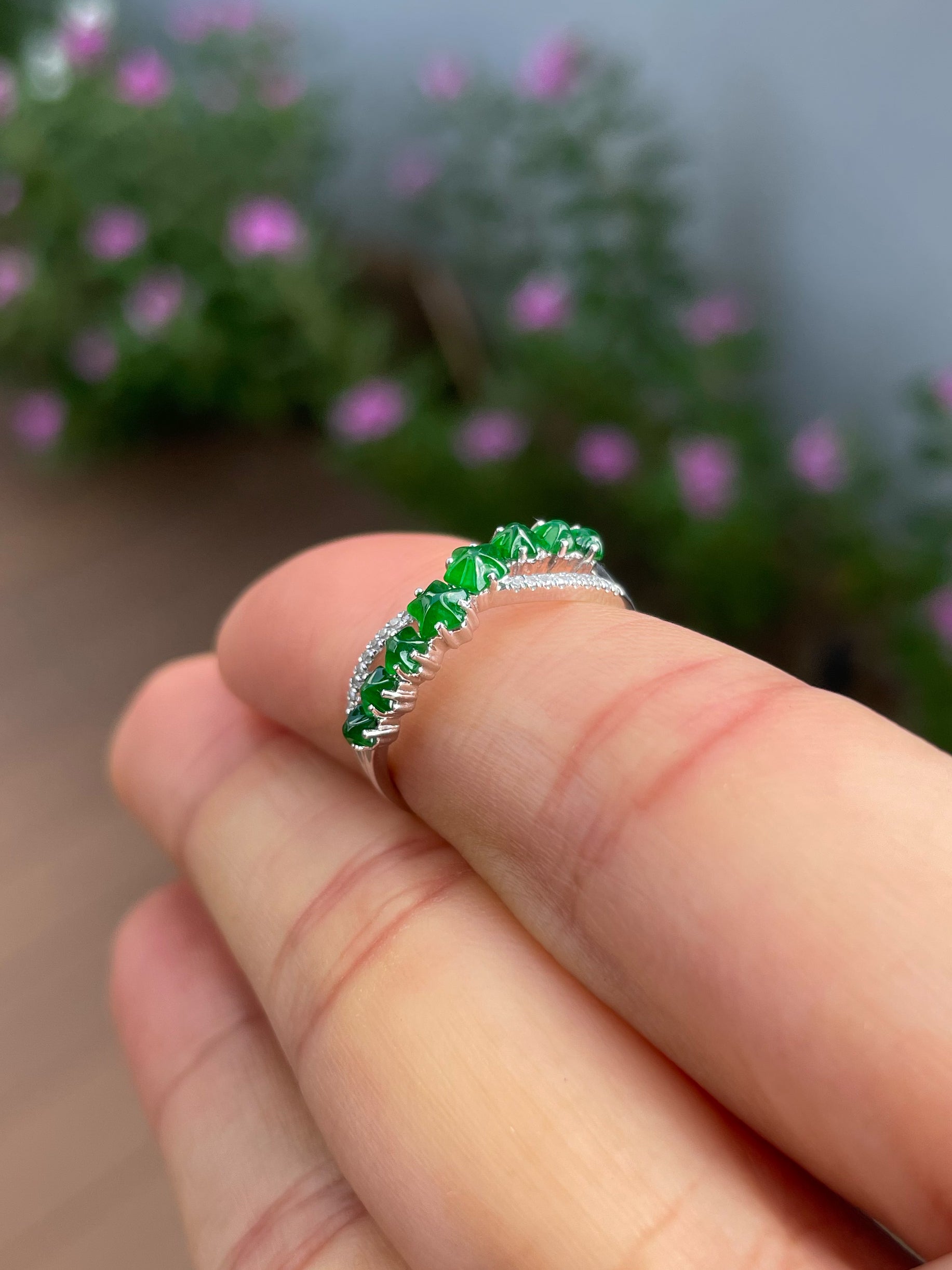 Photographs of the jade ring are taken in natural lighting and are not enhanced in any way. The last two photos are taken indoor to give an accurate representation of how the jadeite ring appears in different lighting conditions.