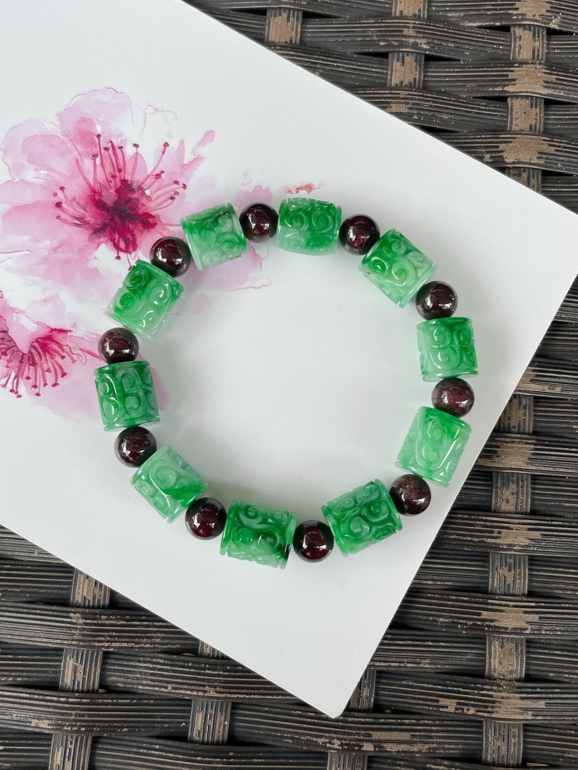 Between each jadeite barrel is a deep red bead, carved from natural garnet. The round beads are almost black in colour, with subtle hints of red showing when they catch the light. Strung with the bright green jadeite barrels, these beads add a modern touch to the jadeite bracelet with their distinct contrast in colours.