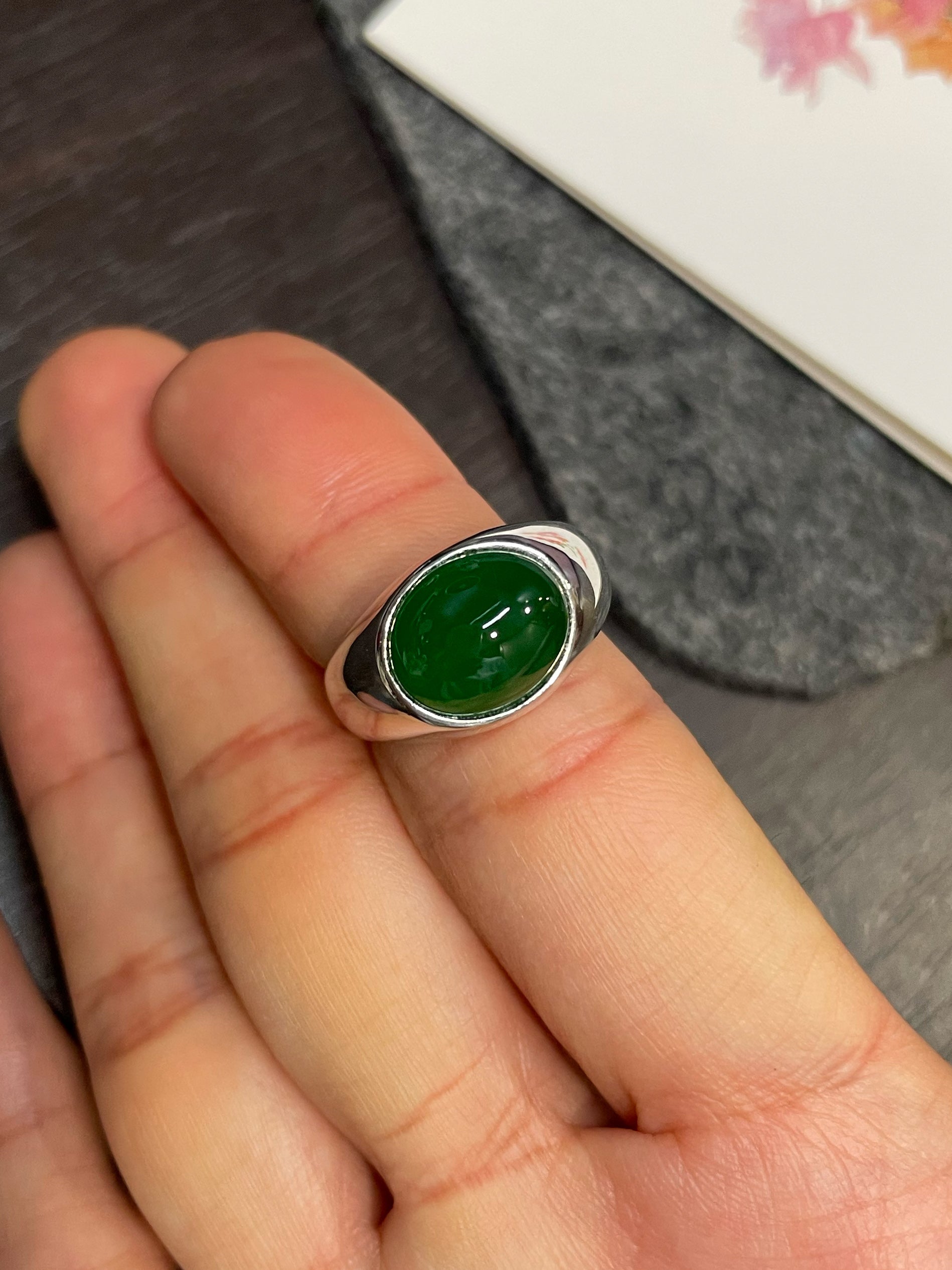 Fully framing the jadeite cabochon, this jade ring design is extremely comfortable to wear with its thicker ring band. The solid platinum setting also gives the ring an increased heft and a more significant feel to the jade ring.