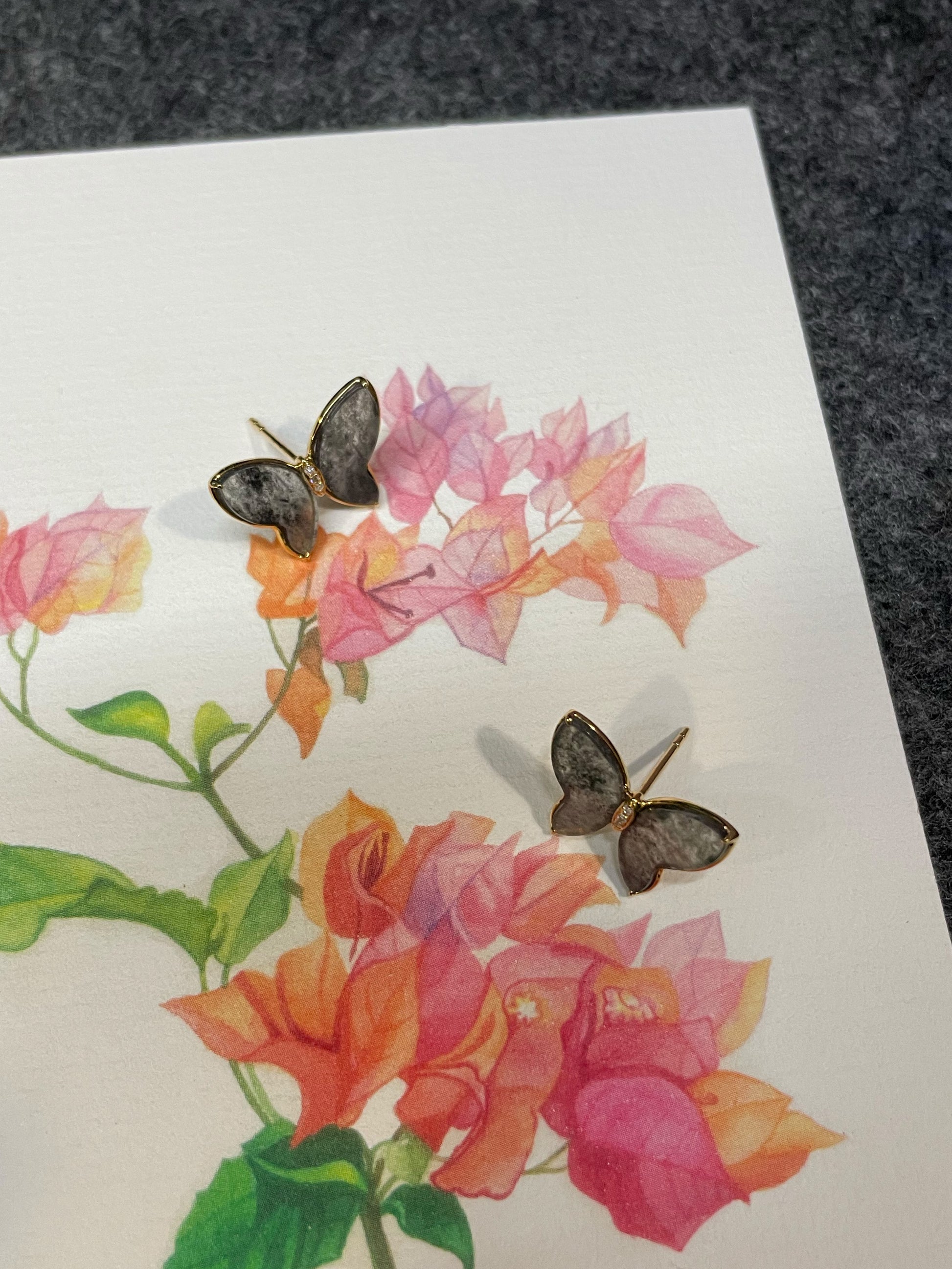 The jadeite carvings are translucent, lending an icy touch to the natural black jadeite. This translucency also gives the jadeite butterflies a 3-dimensional appearance. Worn as earrings, the life-like look of the jadeite butterflies is particularly eye-catching.