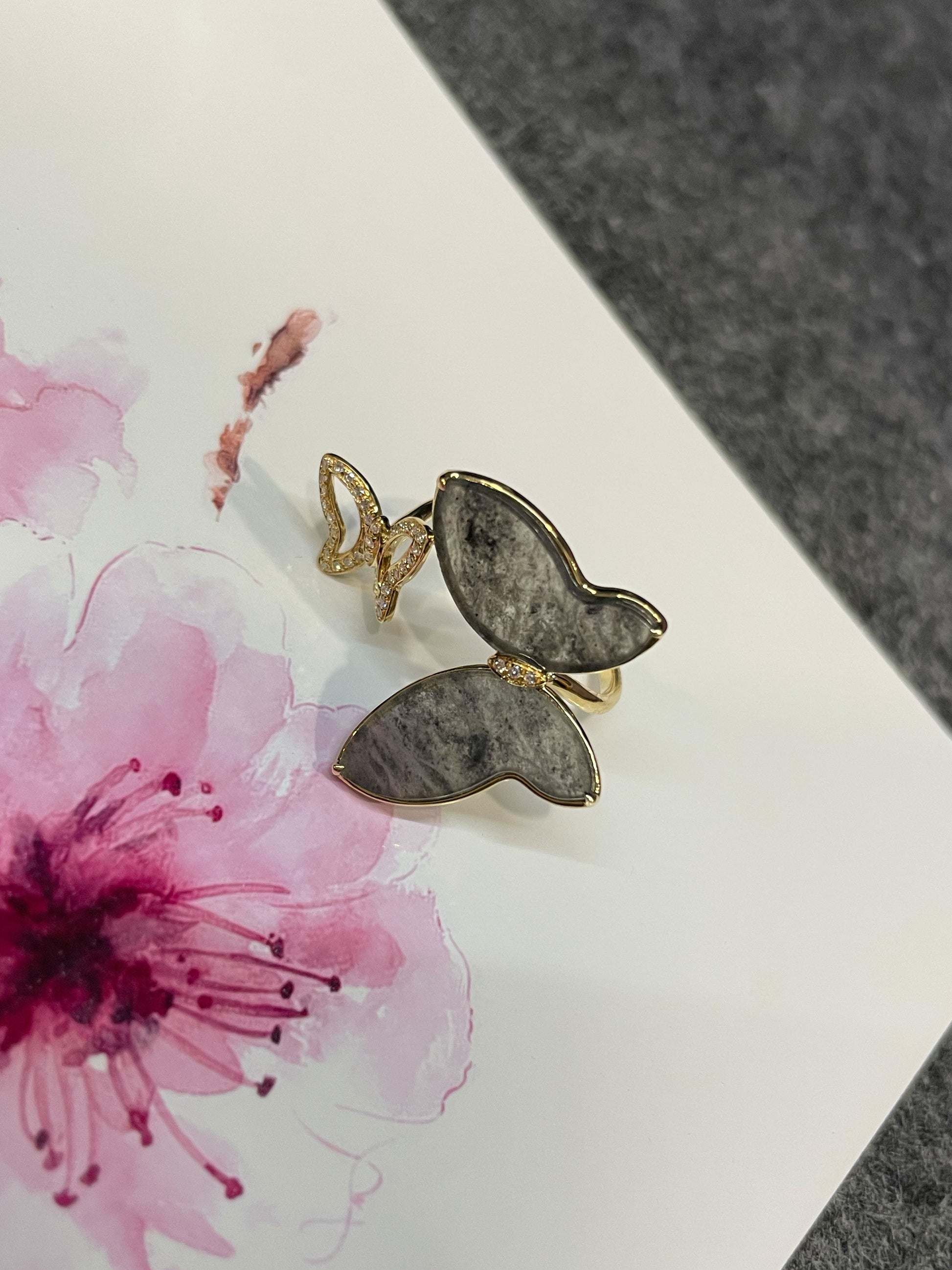 Forming the larger of 2 butterflies in this ring, the natural black jadeite carving has good translucency, creating a frosted appearance whilst worn as a ring. A smaller butterfly is set on top of the jadeite butterfly and this is crafted in 18K yellow gold, sparkling with natural diamonds.