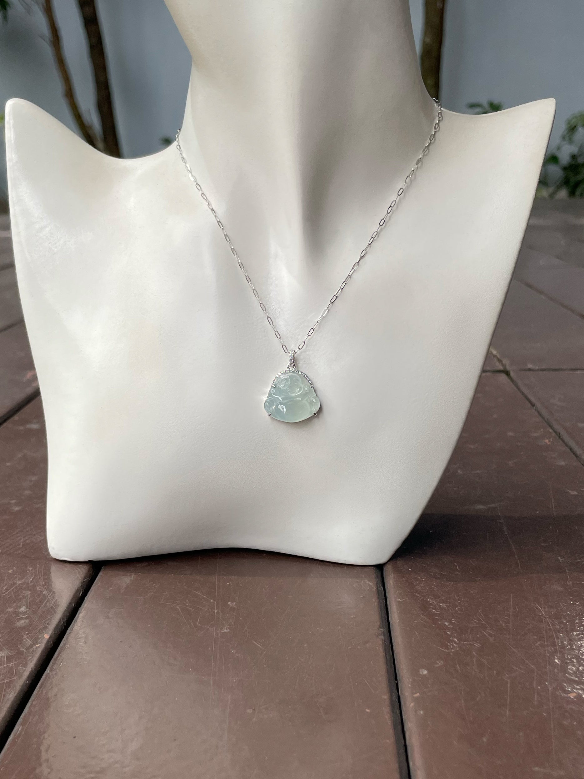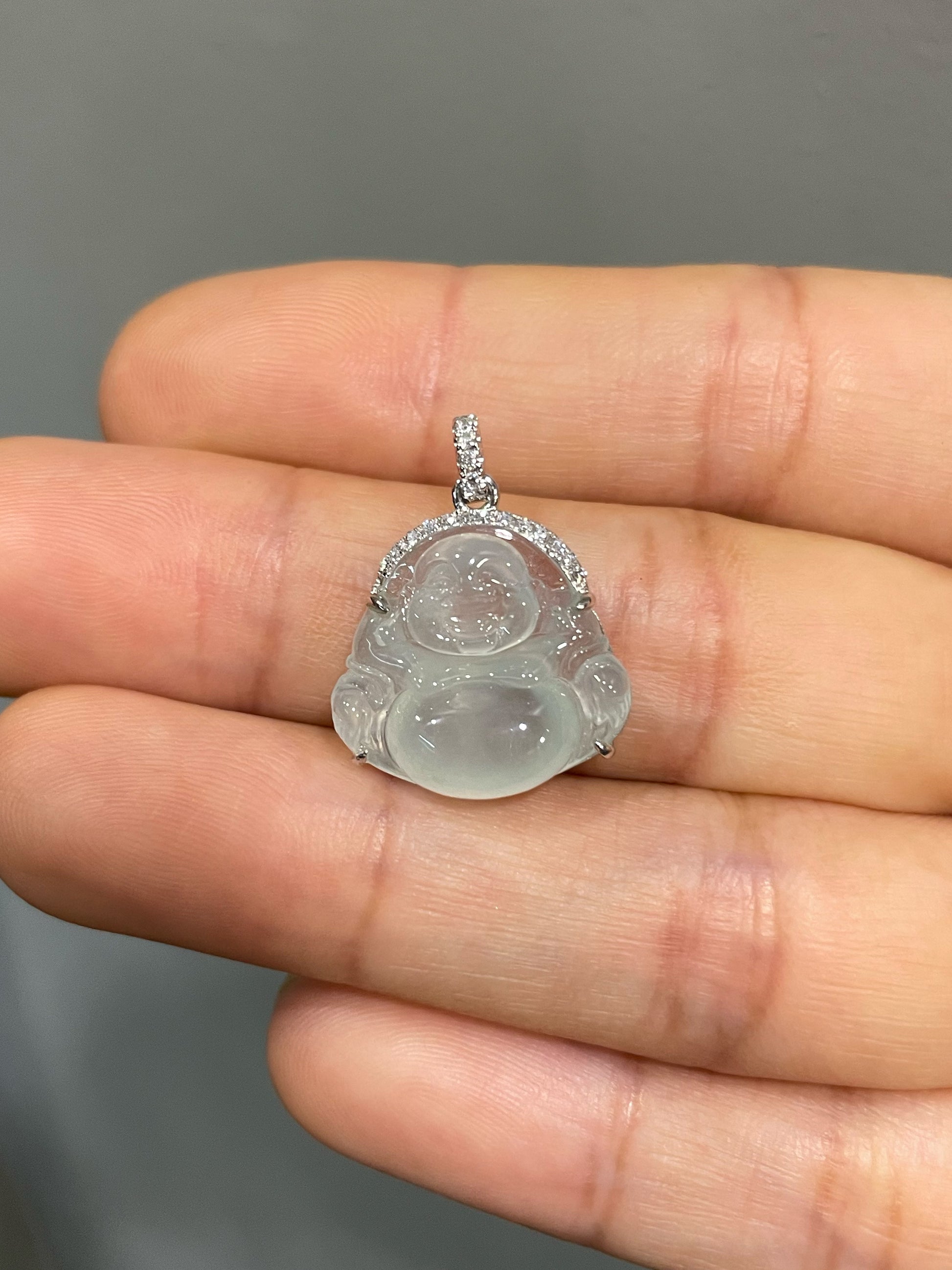 The natural jade set in this white gold pendant is a delicate carving of the deity Laughing Buddha or 笑佛 in Chinese. The jadeite carving is hand-carved from Type A jadeite that is completely colourless and clean without any visible dark inclusions. High translucency of the natural jadeite also adds an icy appearance to the colourless carving, emphasising the intricate 3-dimensional details of the jadeite carving.