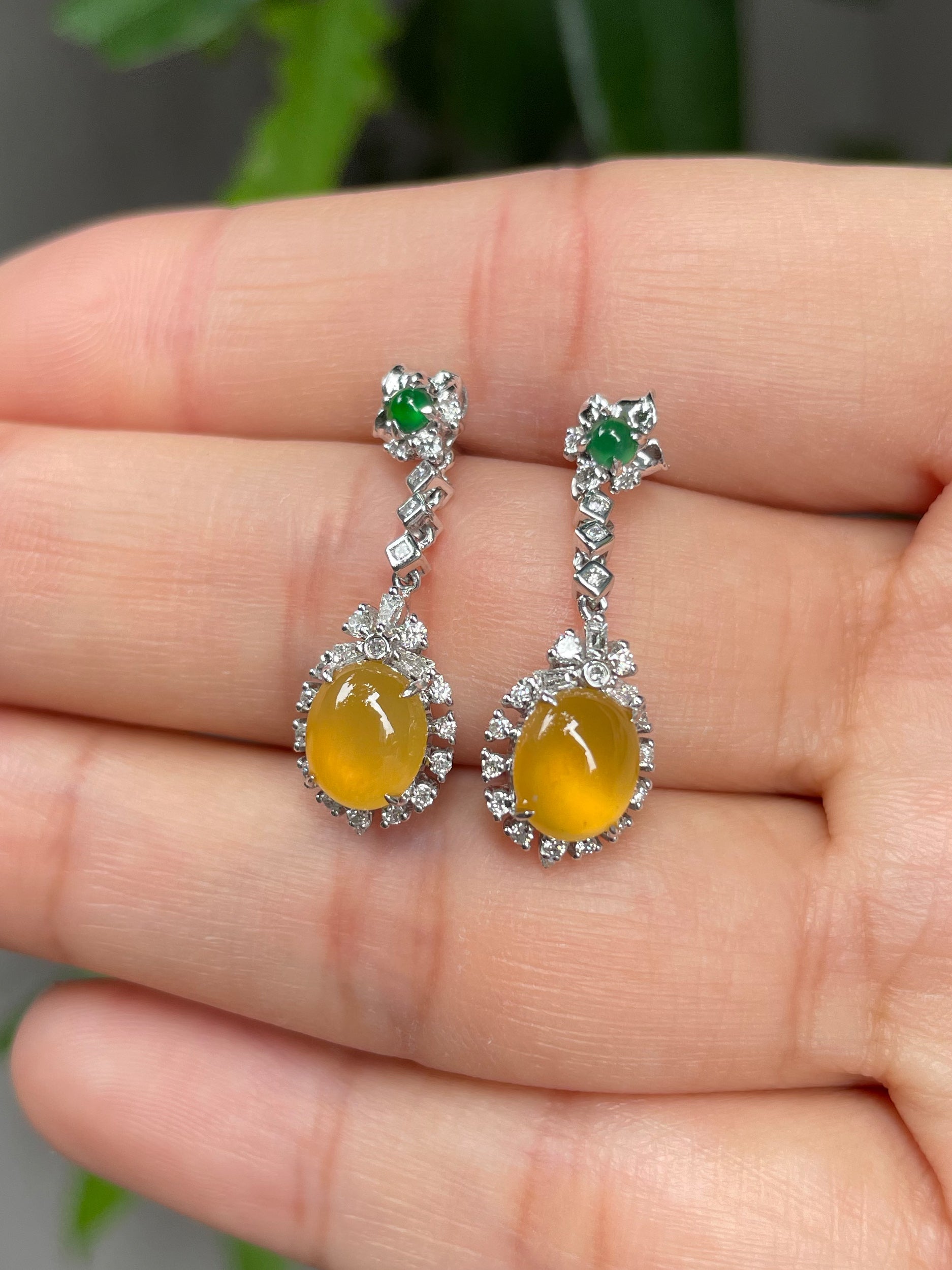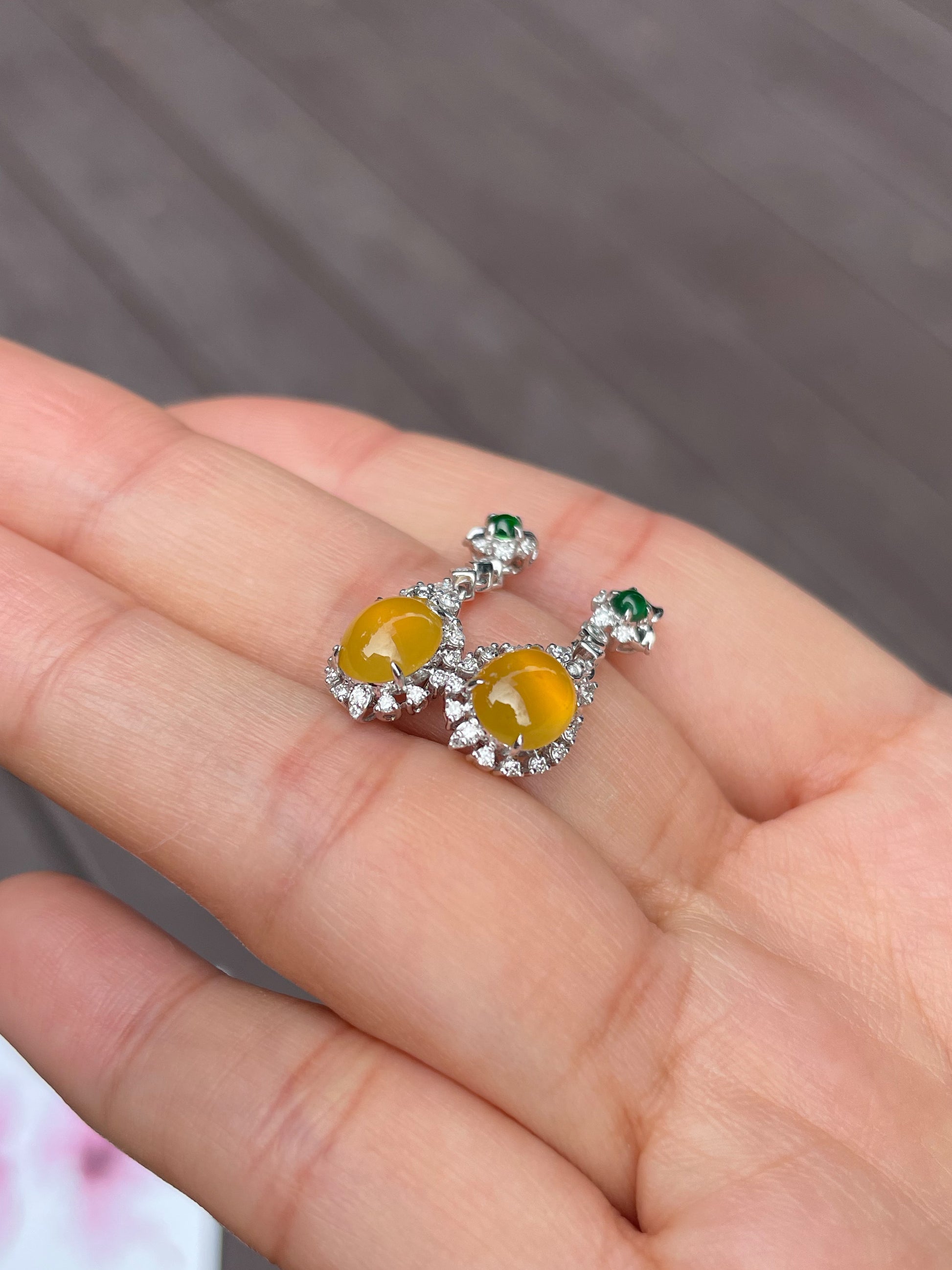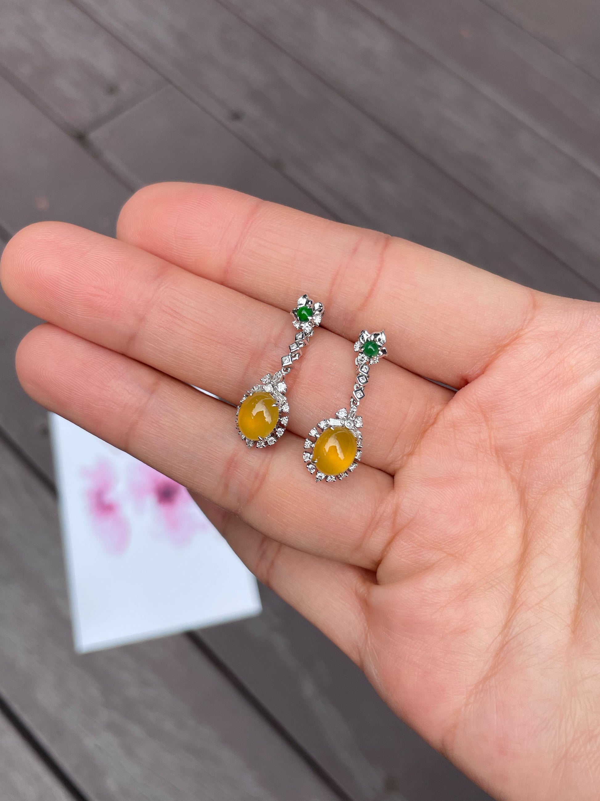 The pair of jade earrings are set with 18K white gold and natural diamonds. A small pair of vivid green Type A jade cabochons adorn the top of the earrings which are set on earring studs. The pair of jade earrings are designed to be worn as stud earrings with the yellow jade cabochons dangling freely.