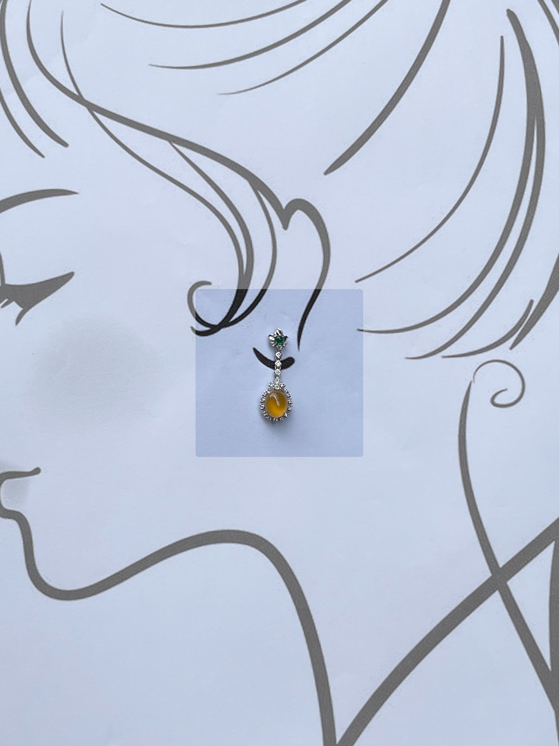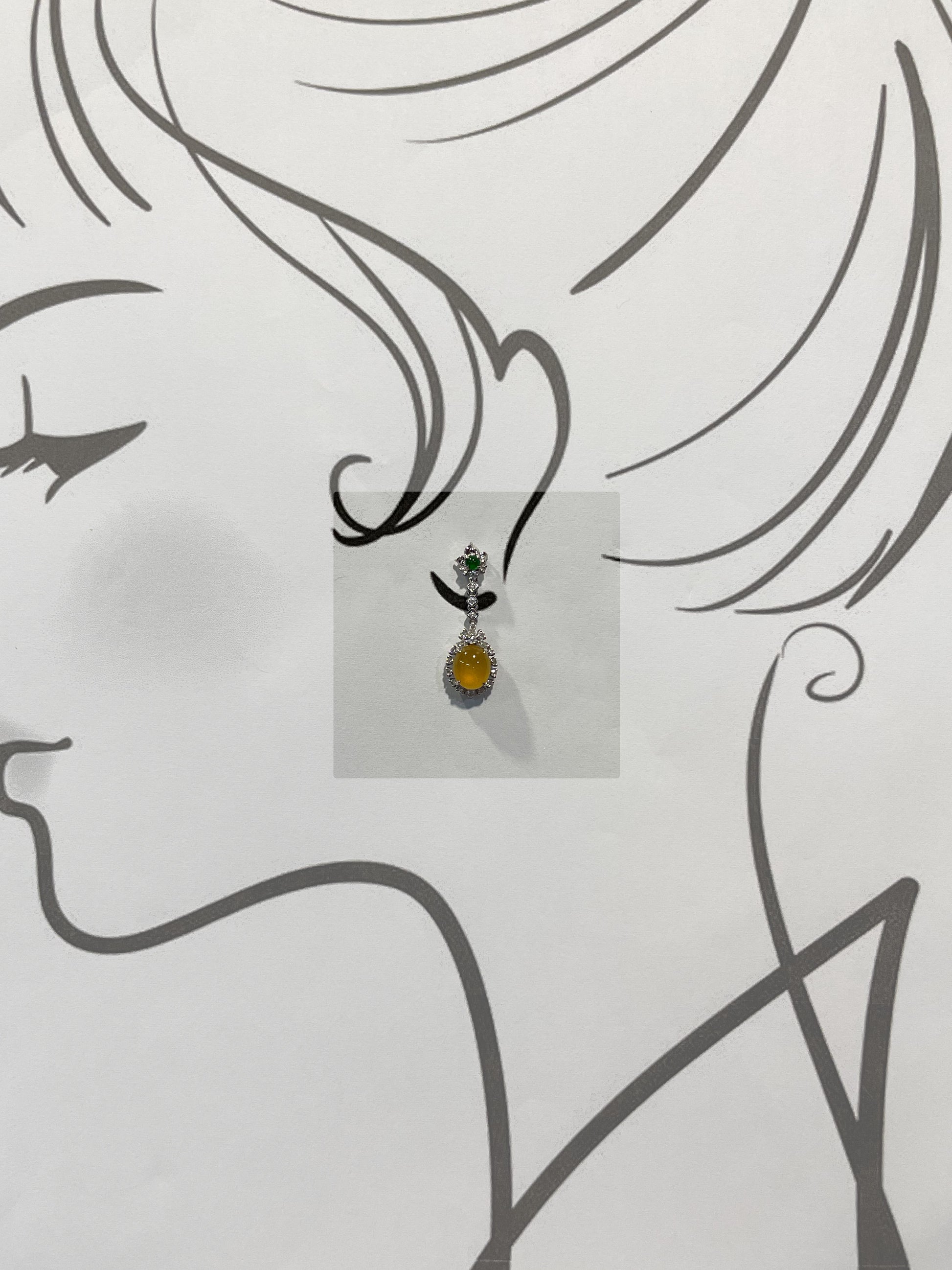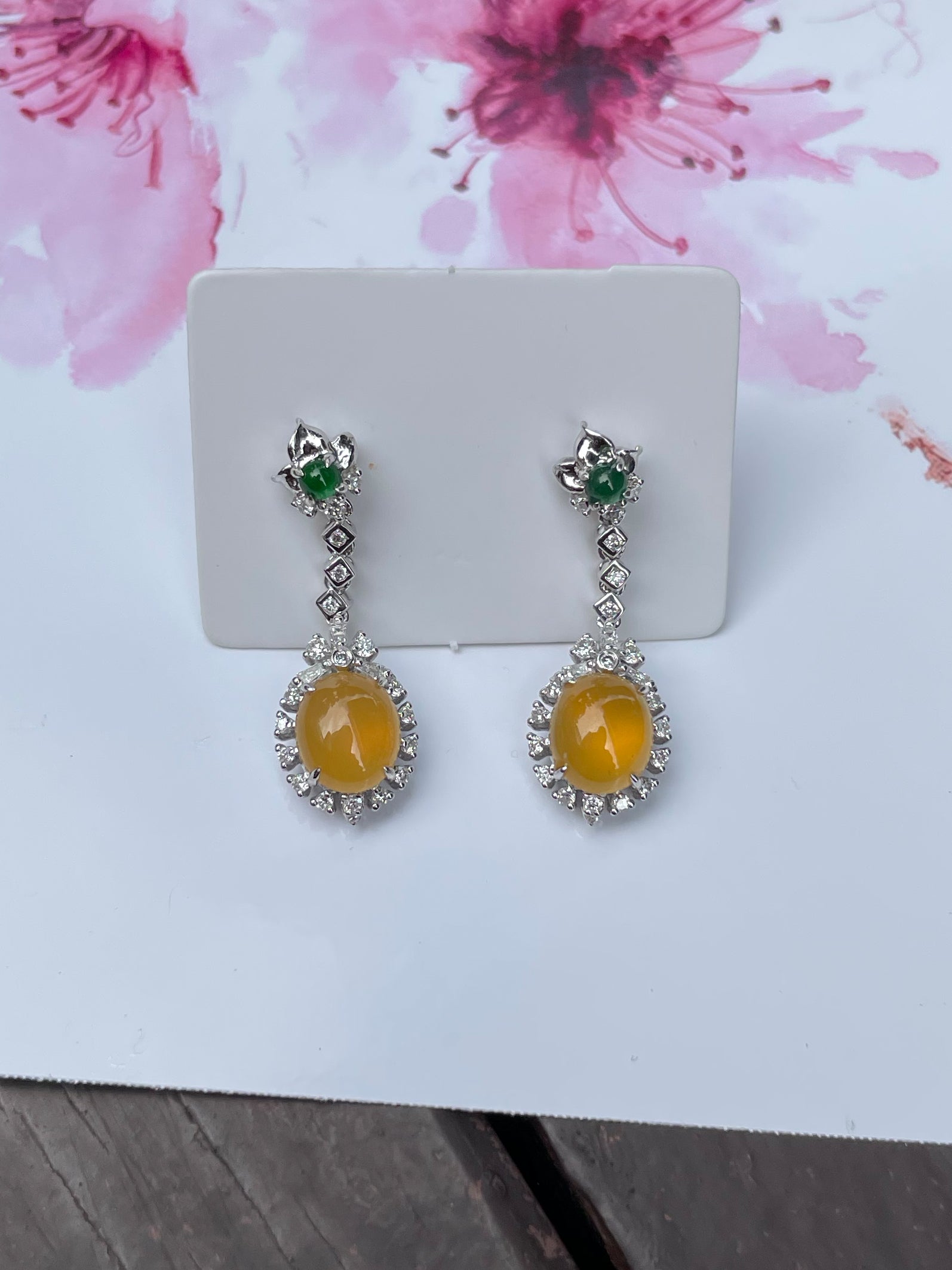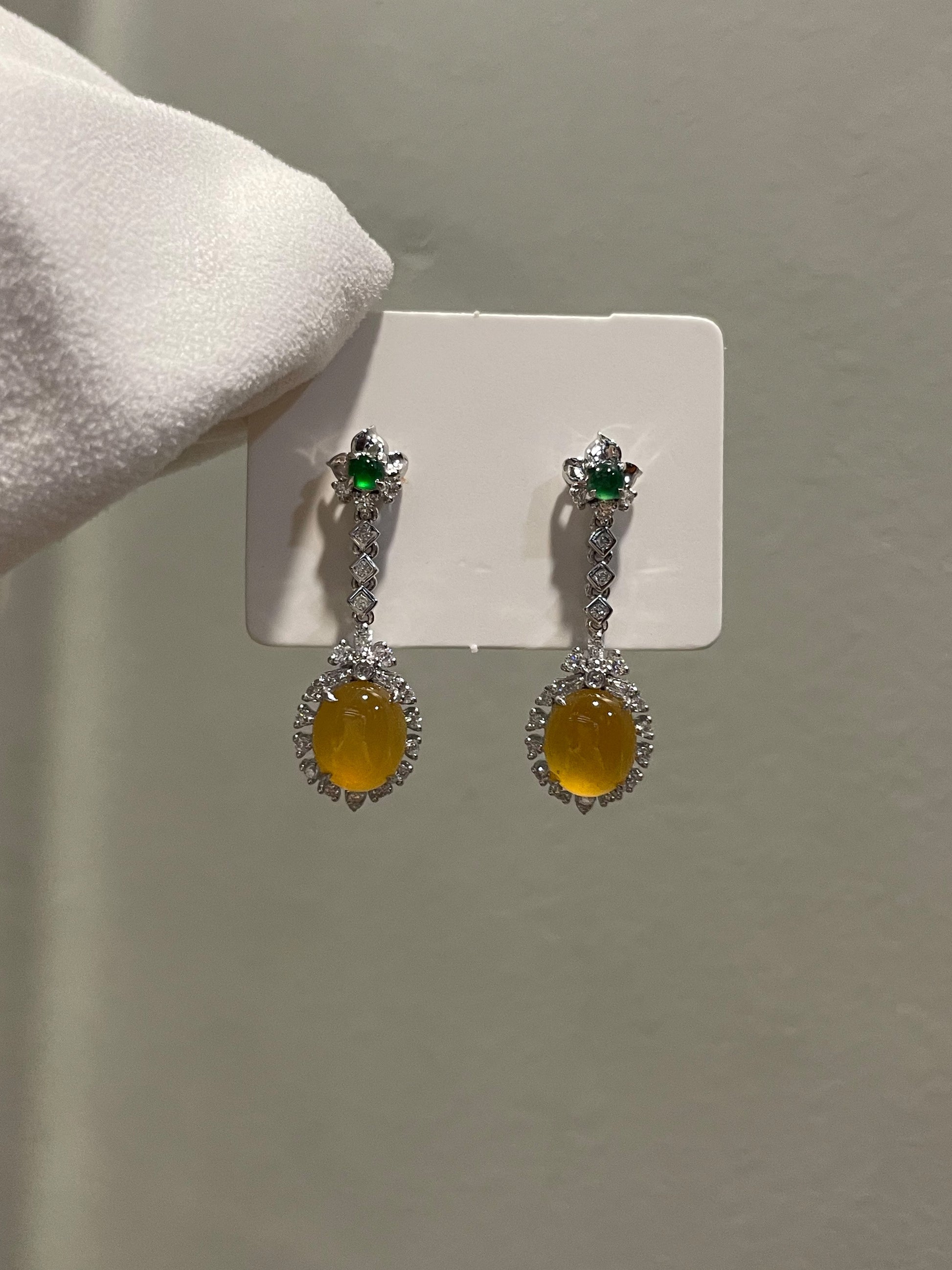 The pair of jade earrings are set with 18K white gold and natural diamonds. A small pair of vivid green Type A jade cabochons adorn the top of the earrings which are set on earring studs. The pair of jade earrings are designed to be worn as stud earrings with the yellow jade cabochons dangling freely.