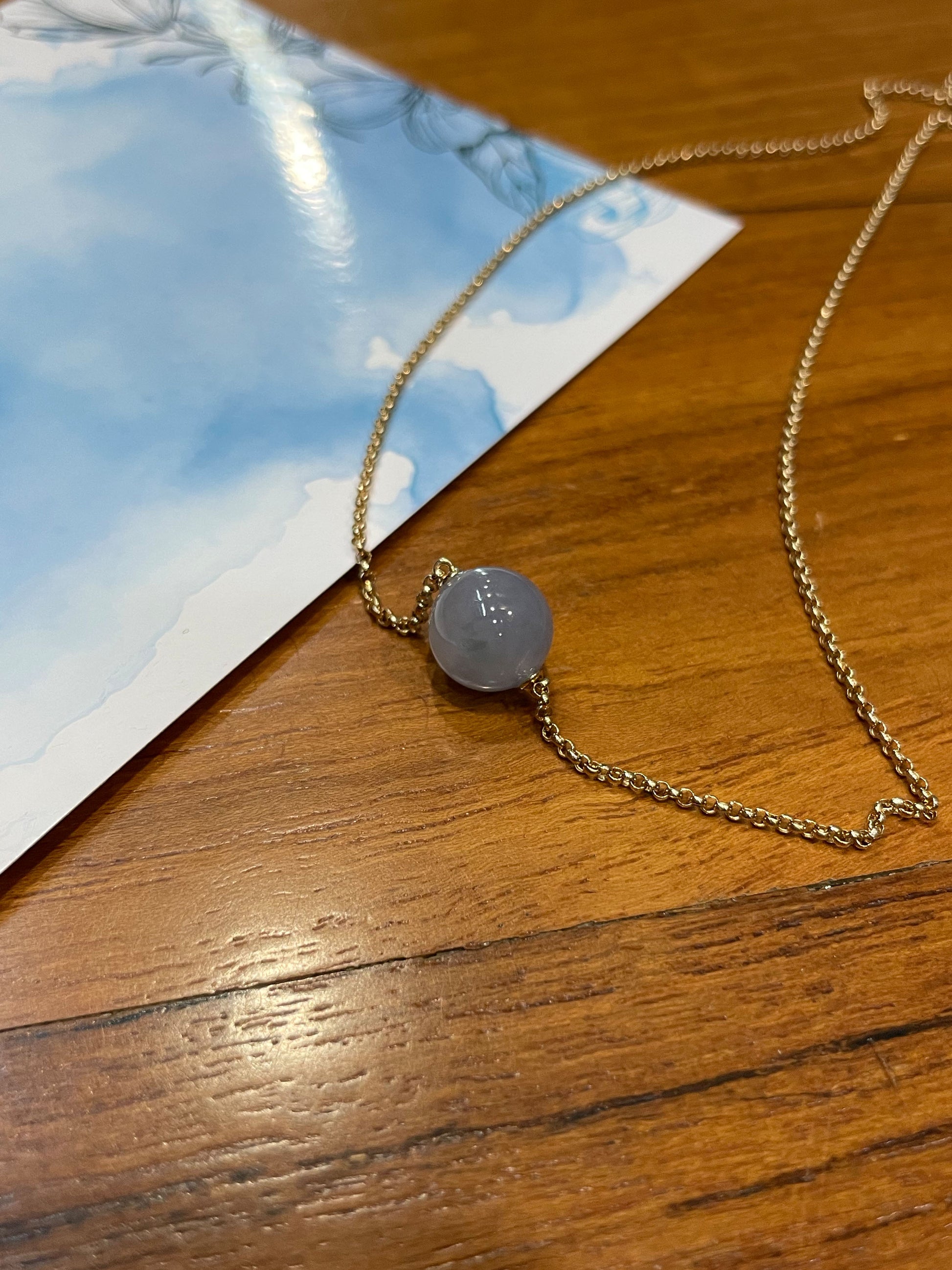 This is a simple yet elegant necklace crafted with a Type A lavender jadeite bead and 18K yellow gold.