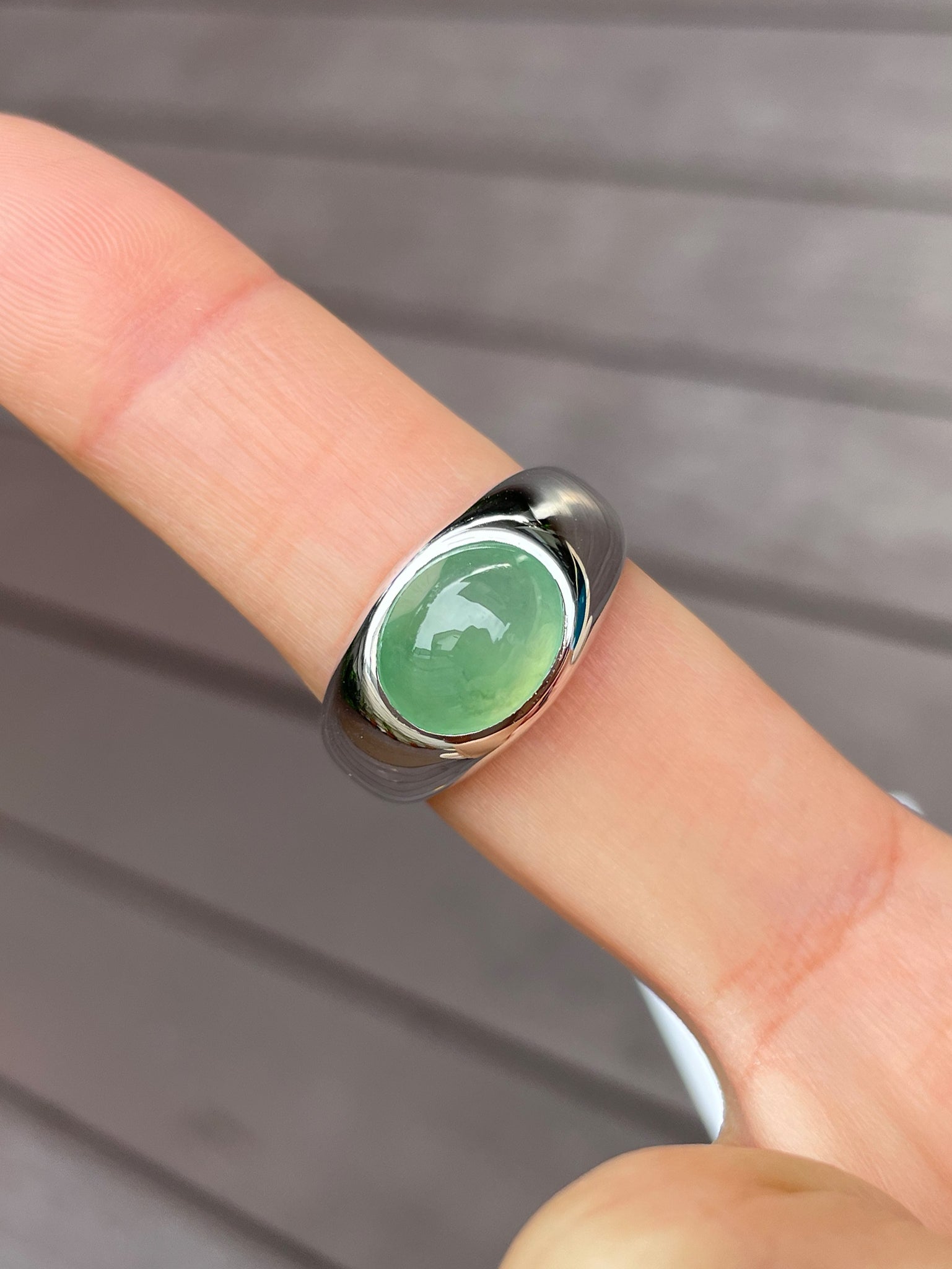 This classic jade ring is set with 18K white gold framing a beautiful highly translucent jadeite cabochon in simple bezel setting. The centre stone is a Type A jade cabochon with a light green hue. The high translucency of the jadeite material complements the light pastel hue giving the classically designed ring an elegant look and feel due to the fine quality of the jade centrepiece.