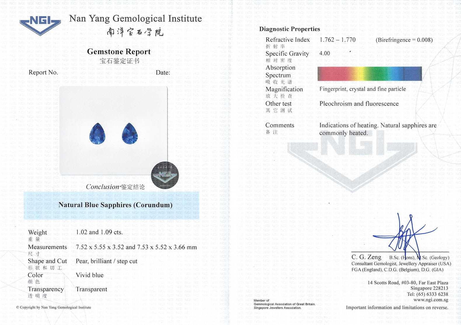 As a note, this pair of natural blue sapphires is heated. The NGI laboratory report for this pair of sapphires is attached.