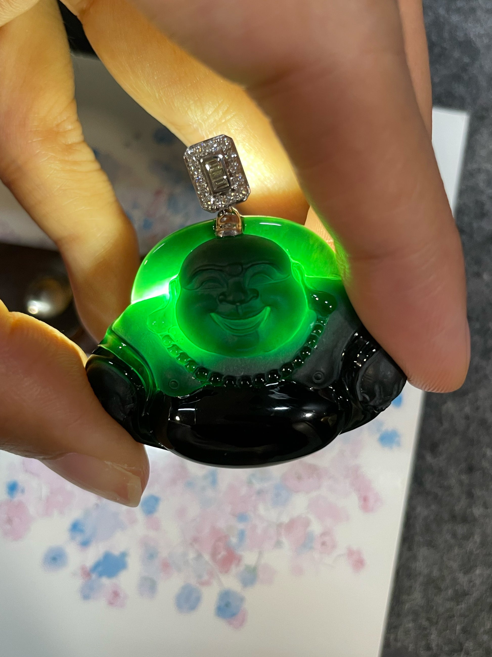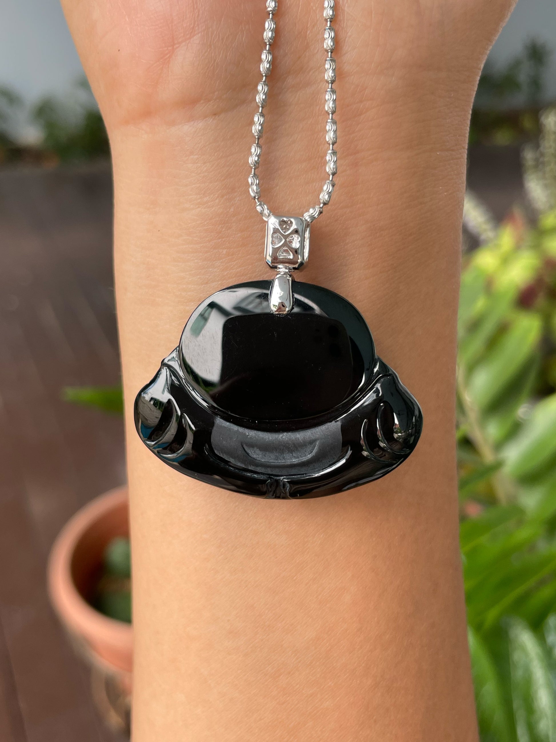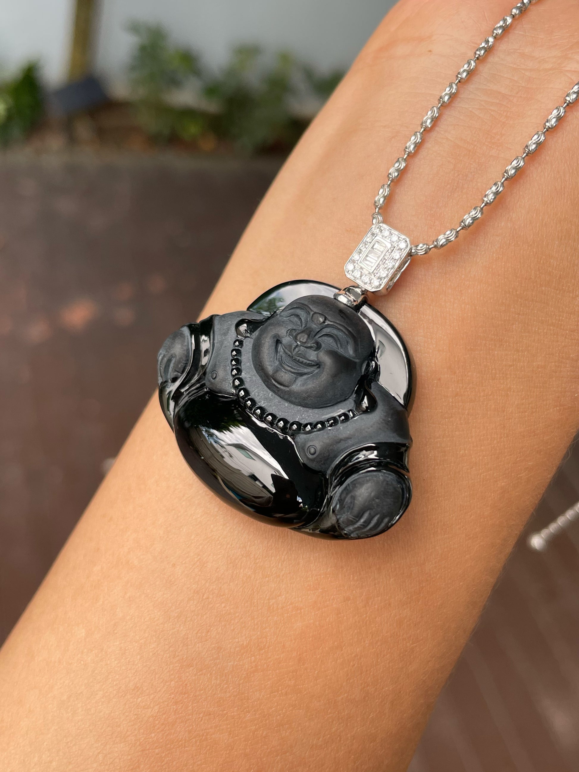 This Laughing Buddha pendant is crafted with natural omphacite jade, also known as 墨翠. A smooth inky black colour in natural lighting, this rare omphacite carving showcases a bright green colour when illuminated with light. The omphacite carving's thickness is a testament to the translucency of the omphacite, easily allowing light to pass through. This level of translucency also allows the clarity of the omphacite to be observed easily.