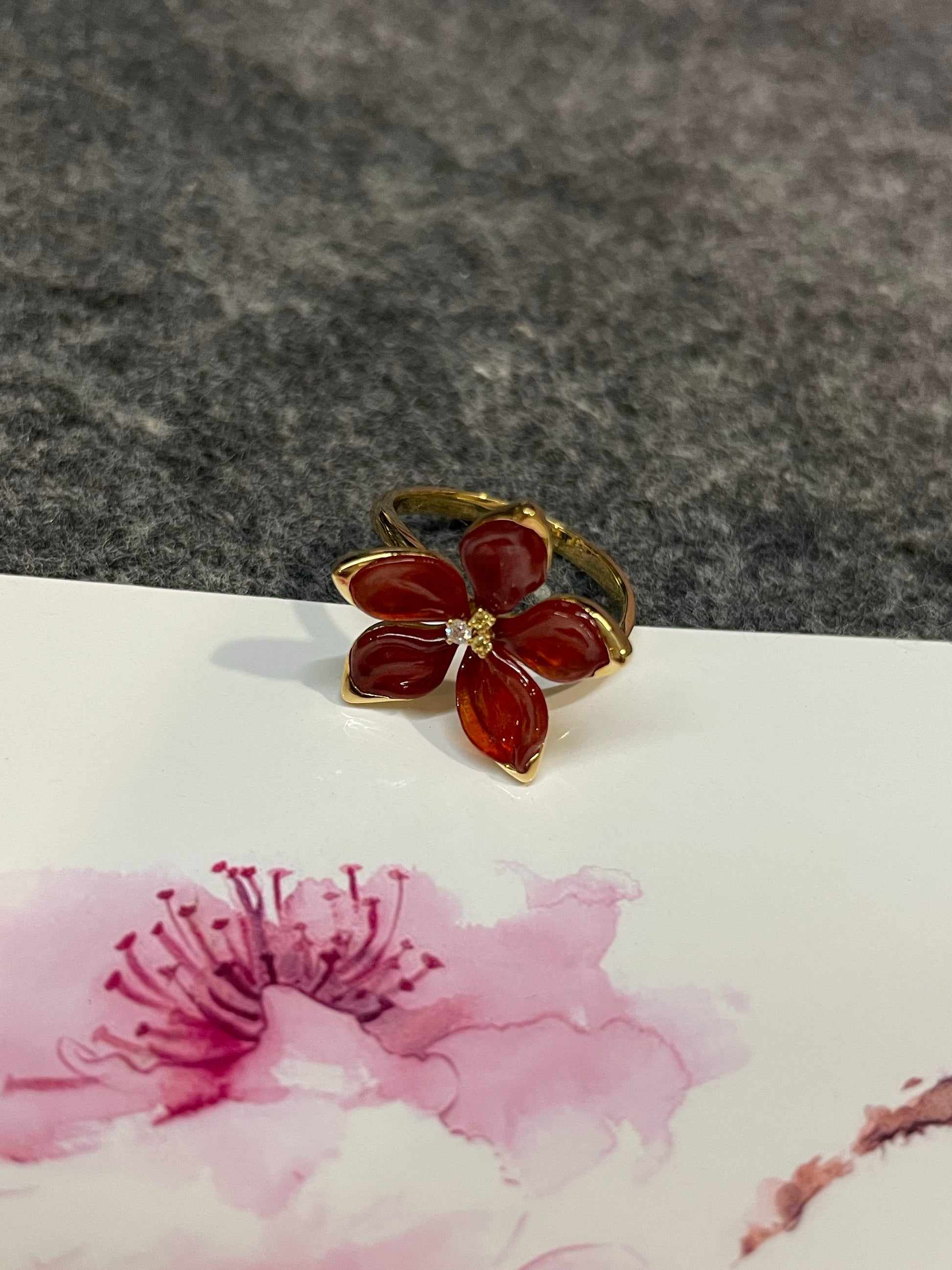 Designed as a flower, the 5 petals are crafted from natural jadeite with a striking orangy red colour. This fiery colour is rarely seen in natural jadeite and simply lights up the floral design of this jadeite ring. Each petal carving is unique and is intricately carved to emphasize the 3-dimensional appearance of the flower, bringing the floral design to life.