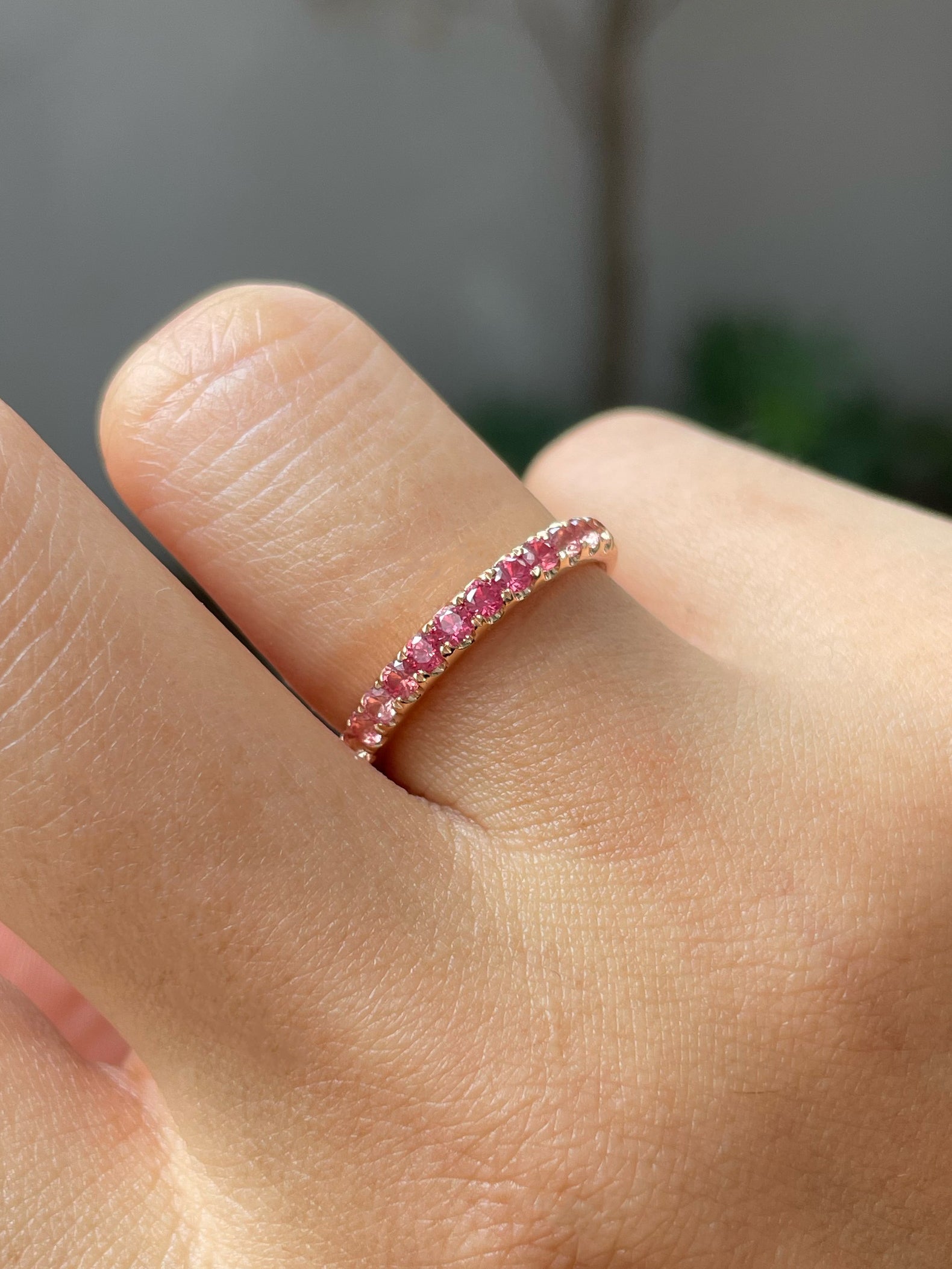 The ombre colours in these 2 sapphire rings vary from an orangey pink to a vivid pink colour. Each ring is crafted with 12 natural sapphires carefully selected for their unique colours. Set in 18K rose gold, the gradient of colours in these rings comes together beautifully in a simple yet timeless design.
