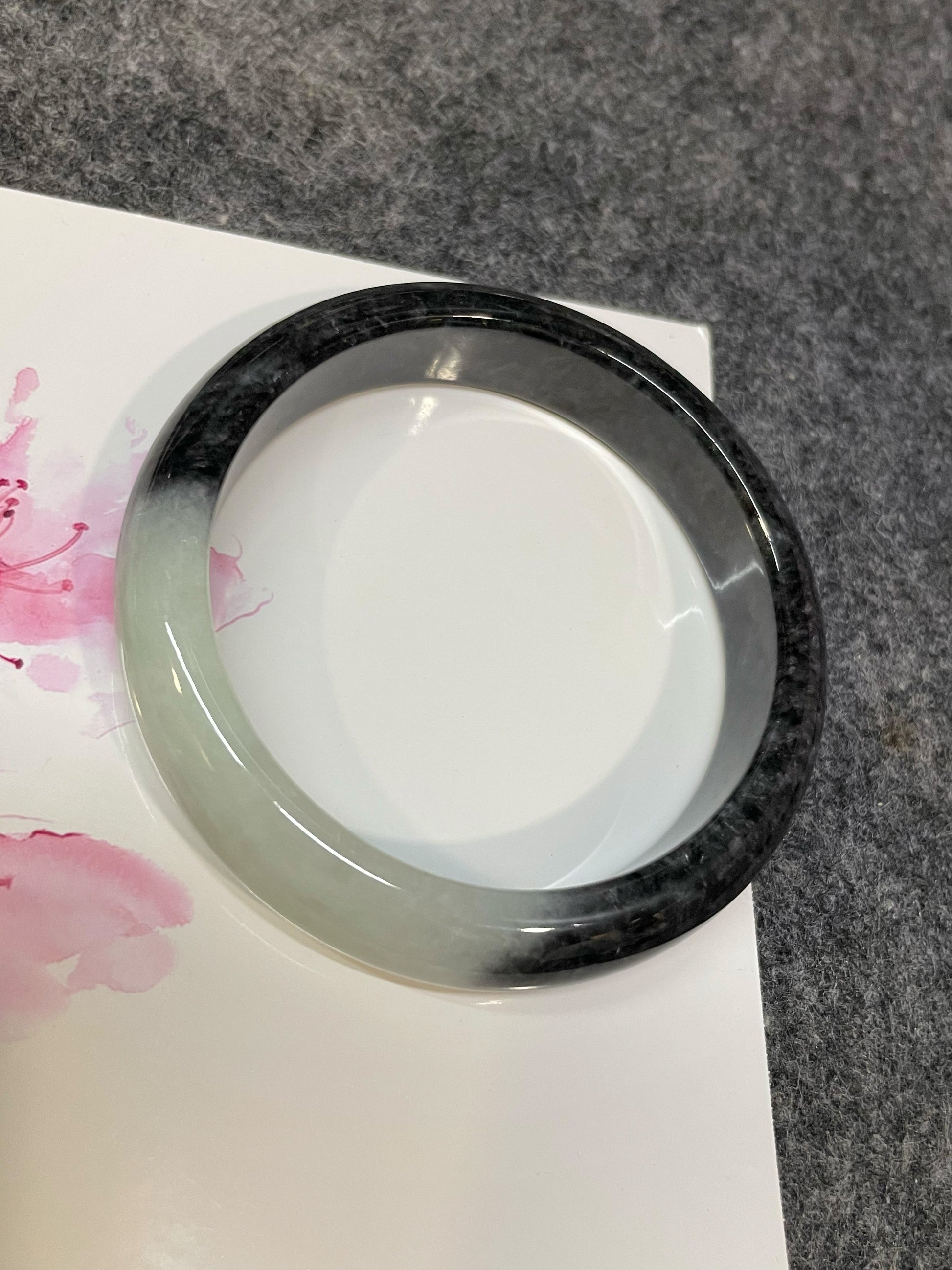 This is a natural, Type A jadeite bangle with monochrome white and black colours. The clear contrast of colours gives the classic jade bangle a modern appearance allowing it to go easily with a sharp office attire whilst also blending beautifully with more contemporary or casual outfits.