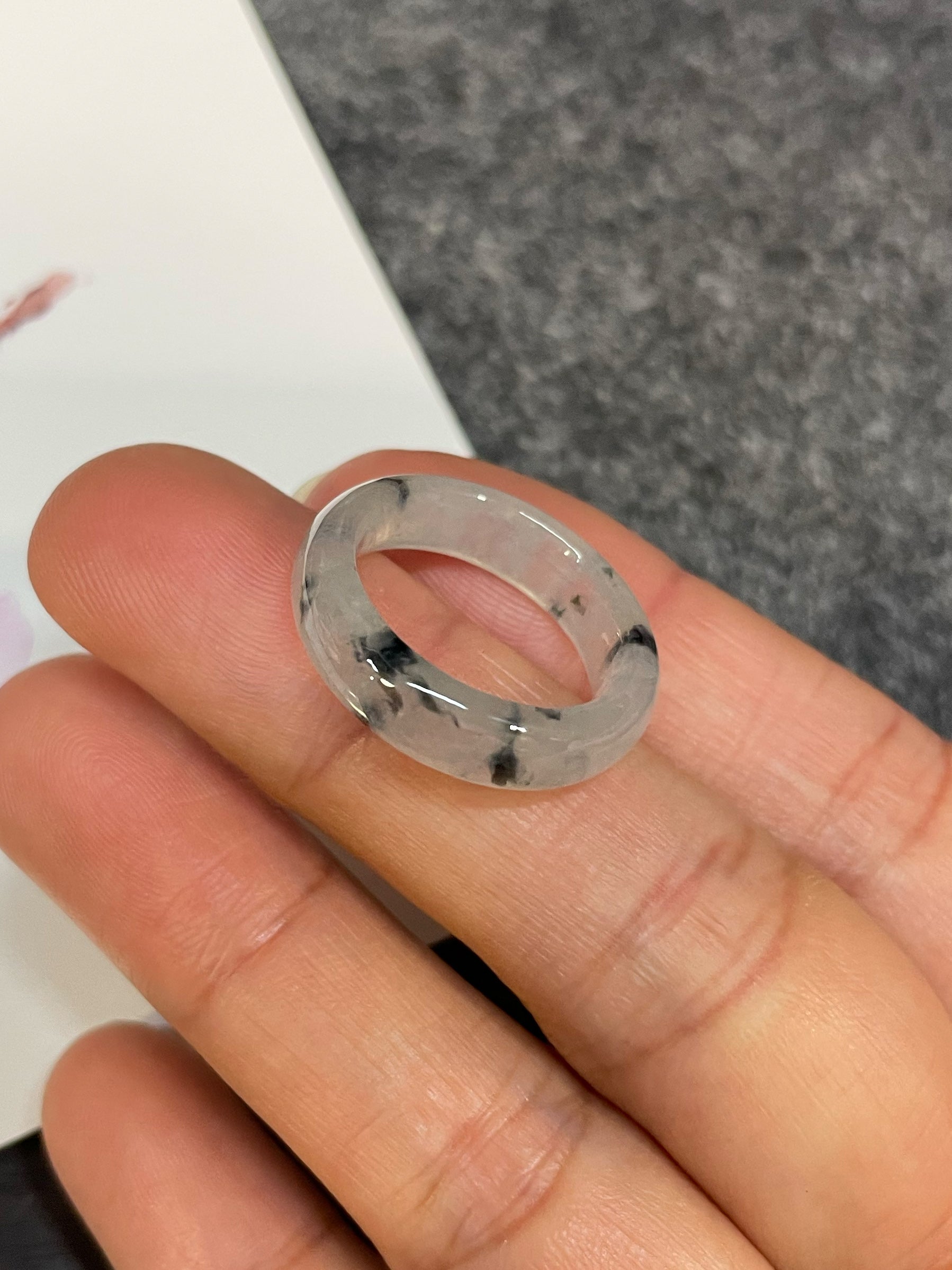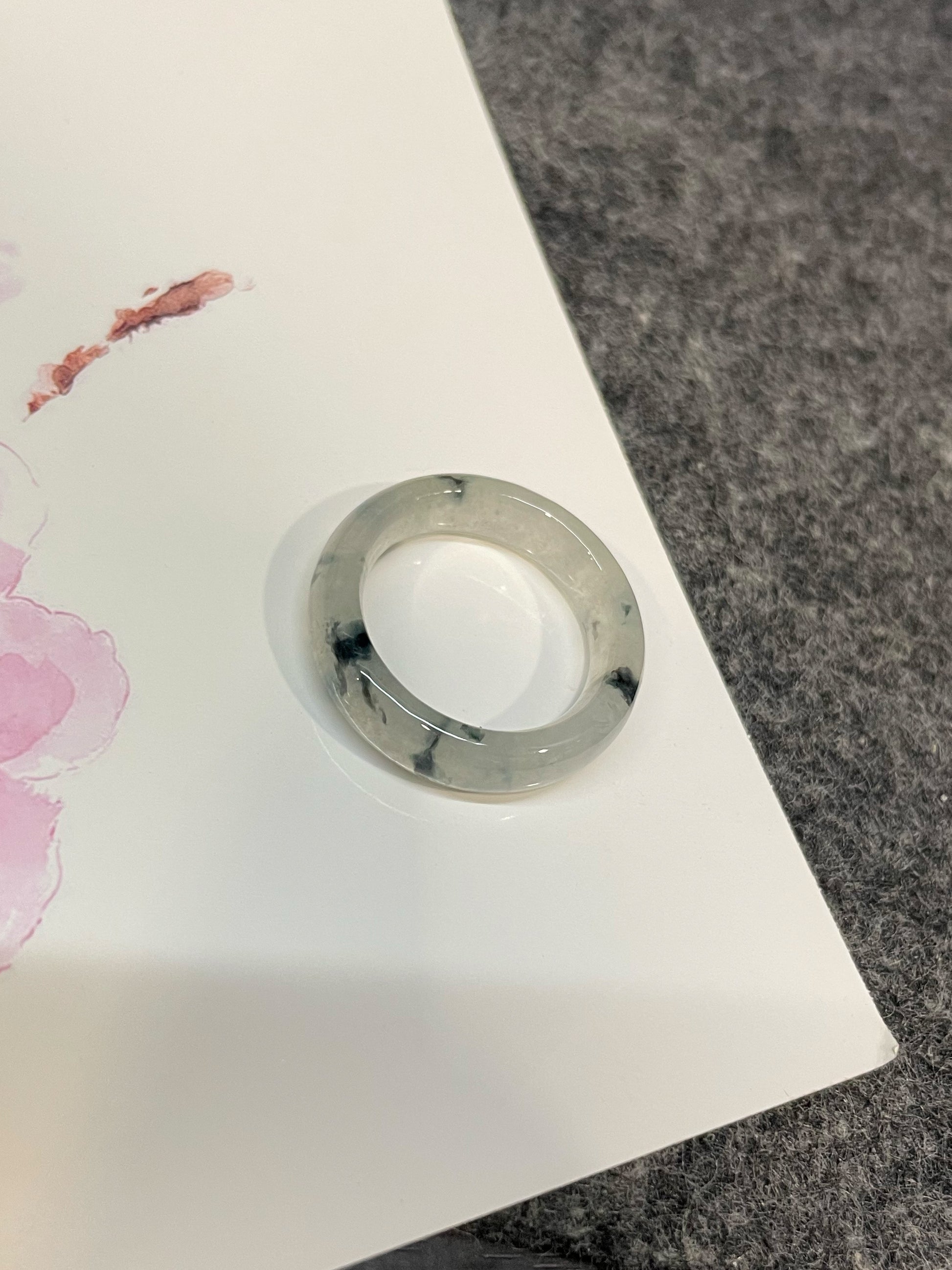 The icy white colour of the ring is aesthetically decorated with splashes of inky black that are spread across the ring band. The deep black colour presents a striking contrast to the colourless jadeite, giving the appearance of black ink dissolving in clear water.